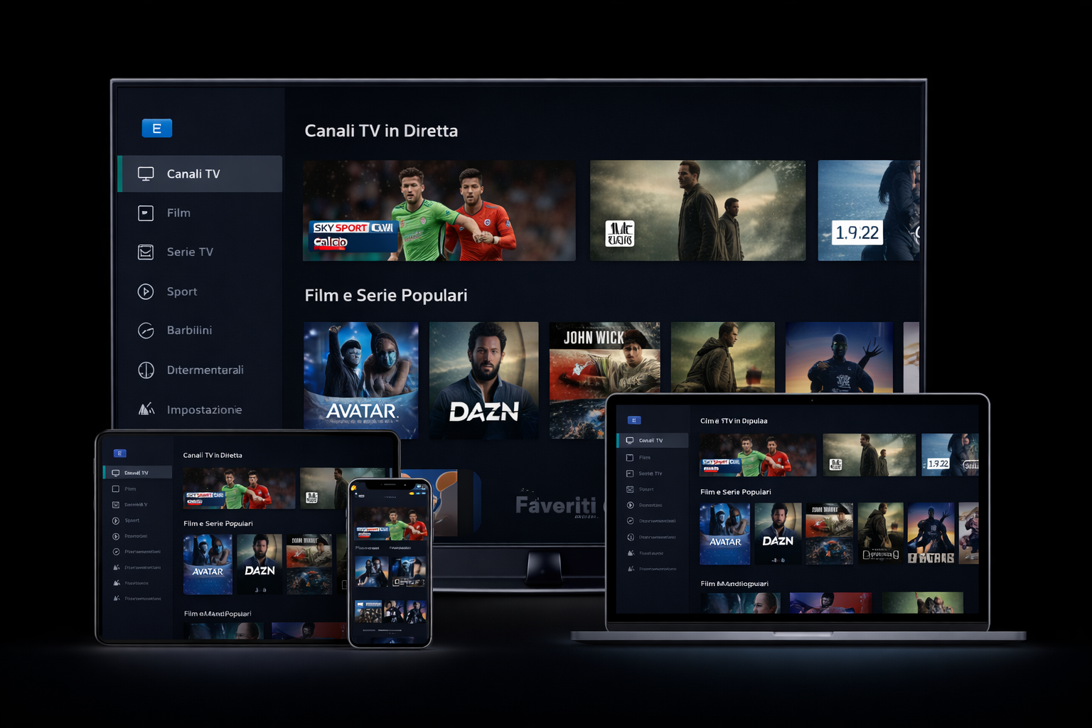 Guarda canali IPTV, film e sport su Smart TV, Android TV, Firestick, smartphone, tablet e computer con configurazione semplice.